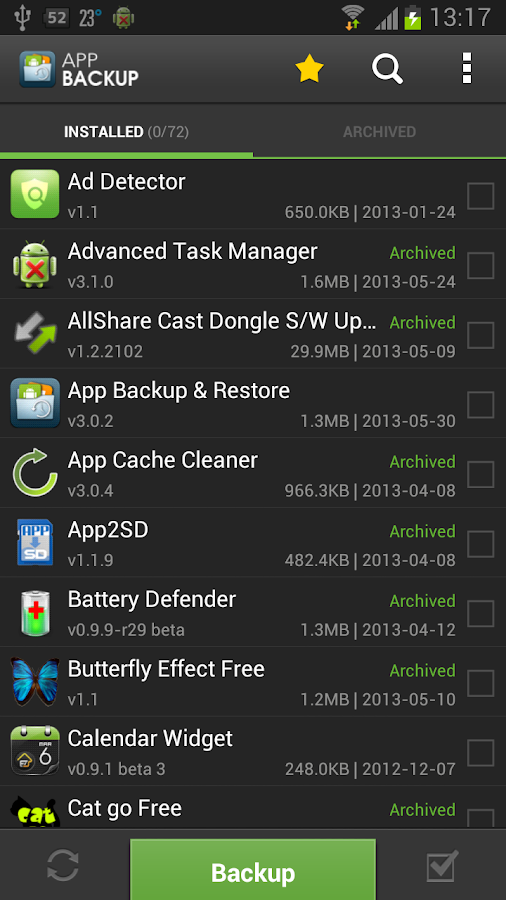 A: It requires the dropbox already installed in your phone, click "Archived" Tab, long click on the app that you want to send, then click "Dorpbox".